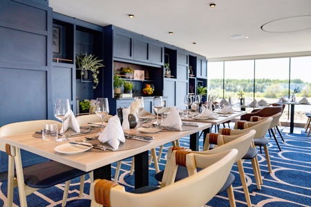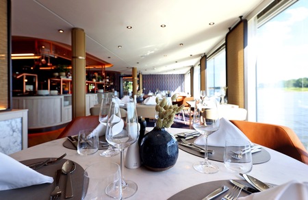 The Market Restaurant is the ship’s Dining Room (no table reservations needed). It has an open kitchen and Buffet station. The A-ROSA RIVA's dining room menu features low-calorie, itinerary-based (regional) specialties and traditional Mediterranean dishes. Food on board is prepared with fresh locally sourced ingredients and products.