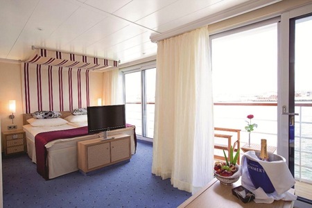 Spacious and comfortable outside cabin with Juliette balcony. Elegant design and first-class materials ensure an atmosphere of well-being. Cabin facilities: safe, air-conditioning, TV, hair dryer, bathroom with shower and toilet, sauna towel, wool blanket, telephone, bathrobe.