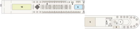 The ship's top deck features a rectangular∘ swimming pool, complete with a shower and a large sunbathing area with loungers.