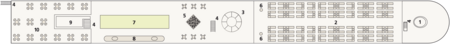 The ship's top deck features a rectangular swimming pool, complete with a shower and a large sunbathing area with loungers.