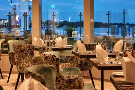 The Panorama Restaurant offers our guests a relaxed atmosphere. We serve both international and regional dishes. The day on board begins with a rich continental breakfast buffet, where we are also happy to serve you various freshly prepared egg dishes from the kitchen on request. At lunchtime, you have the choice between varied menus and buffet specialties in the Panorama Restaurant or a light alternative in the Panorama Bar. In the evening, we offer our guests finely composed, multi-course menus. A vegetarian alternative is always available. Hot coffee and tea are available throughout the day. All meals are based on the excursion times, which is why breakfast can also be served very early in the morning.