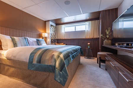 Each cabin features a spacious bathroom with a walk-in shower, luxurious Rituals bath products, and a hair dryer, along with a fixed panoramic window that fills the space with natural light. Thoughtful touches like a comfortable double or twin bed, generously-sized wardrobe, secure in-room safe, flat-screen TV, individual climate control, and direct dial telephone ensure a restful and well-equipped stay.