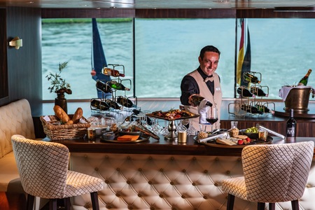 The Panorama Restaurant offers our guests a relaxed atmosphere. We serve both international and regional dishes. The day on board begins with a rich continental breakfast buffet, where we are also happy to serve you various freshly prepared egg dishes from the kitchen on request. At lunchtime, you have the choice between varied menus and buffet specialties in the Panorama Restaurant or a light alternative in the Panorama Bar. In the evening, we offer our guests finely composed, multi-course menus. A vegetarian alternative is always available. Hot coffee and tea are available throughout the day. All meals are based on the excursion times, which is why breakfast can also be served very early in the morning.