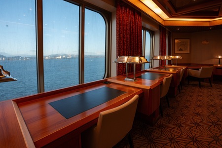 Set across two decks with a ceiling illuminated by a thousand lights, the Grand Restaurant offers diners delightful sea views while enjoying lunch or dinner across an open dining setting.