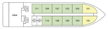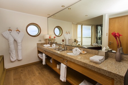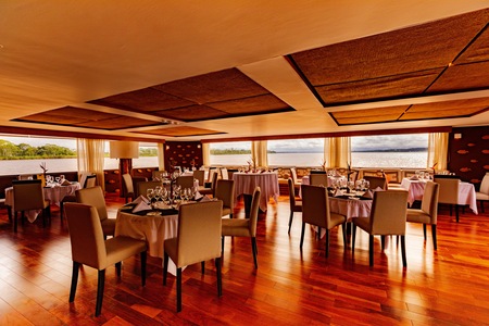 This spacious and indulgent ship boasts an intimate atmosphere with only 22 suites, allowing a maximum of 44 guests on board. Each of these luxury suites features en-suite sitting areas, individual air conditioning, polished and sustainable wood flooring, and floor-to-ceiling panoramic windows that frame the Amazon Jungle in the backdrop.