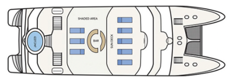 The sun deck features a jacuzzi, a shaded area, premium lounge chairs and a bar.