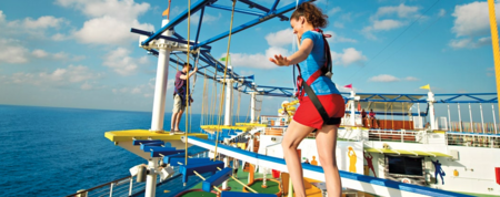 Your Carnival cruise may take you far, far away from the competitive daily rat-race, but you’ll find an oasis of friendly competition at SportSquare™. Take on friends at mini-golf, battle strangers at basketball, or push yourself to new heights at our Ropes Course... or to record-setting low times at the jogging track. SportSquare gets you in the game with soccer and volleyball (the b-ball court converts!), brings pool, foosball and ping-pong to the table, and rounds things out for shaping up with your choice of stationary bikes, elliptical machines, weight-lifting equipment and punching bags. Are you game? (SportSquare offerings vary by ship.)