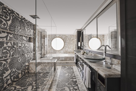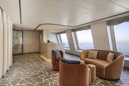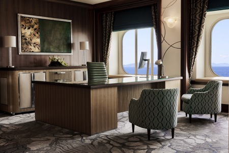 Our largest suite, available in 2023 or 2020 designs, offers two walk-in wardrobes, separate living and dining areas with panoramic ocean views, a study, and a custom built-in bar. There is also a Jacuzzi bathtub with ocean views, separate shower, bidet, and guest bathroom. Enjoy unlimited dining at specialty restaurants, unlimited laundry services, and more.