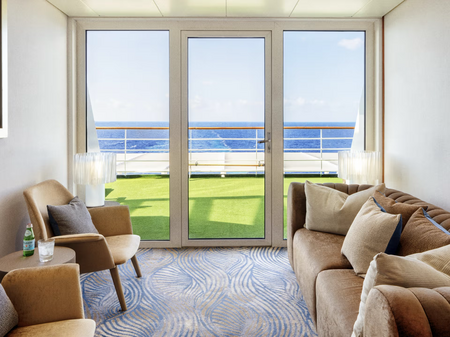 Redesigned in 2023, this elegant suite offers a walk-in wardrobe, separate living room with sofa and dining area, walk-in shower, and two large picture windows. Enjoy special touches such as afternoon canapés, binoculars, a coffee maker, and complimentary laundry, dry cleaning, and pressing services.