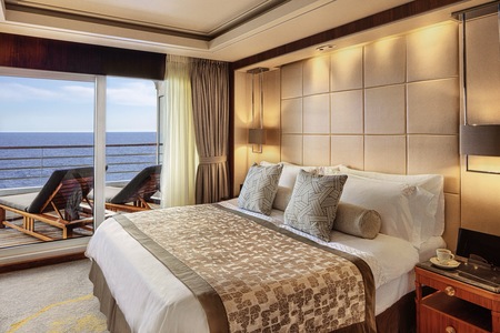 Our largest suite, available in 2023 or 2020 designs, offers two walk-in wardrobes, separate living and dining areas with panoramic ocean views, a study, and a custom built-in bar. There is also a Jacuzzi bathtub with ocean views, separate shower, bidet, and guest bathroom. Enjoy unlimited dining at specialty restaurants, unlimited laundry services, and more.