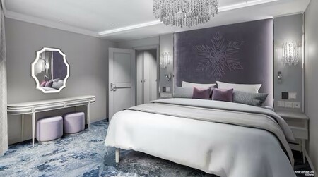 Delight in icy light fixtures, snowflake patterns and a soothing palette of soft blues and grays with pops of periwinkle and purple in the Elsa Royal Suite. Or embrace the beauty of summertime in full bloom in the Anna Royal Suite, decorated in deep greens, rich wood tones and signature purple accents.
