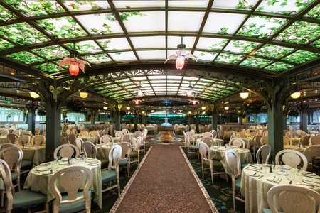 Dine in a serene splendor that recalls an elegant conservatory amid the foothills in France. The restaurant is home to custom-glass flower lights, white trellises, ornamental posts and—at the center—a delightful 7-foot tall cascading fountain featuring a fanciful stone cherub Mickey Mouse. Along the walls, frescoes of rolling hills mingling with lush greenery amid a magnificent blue sky add to the idyllic ambience.