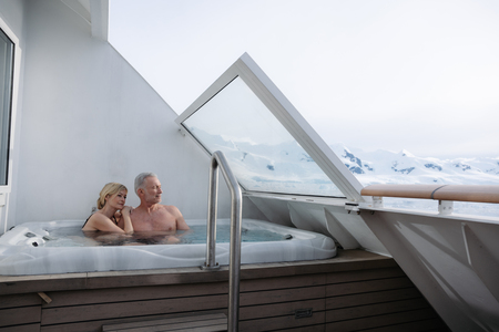 Aft Corner Suite with private balcony and hot tub. Various sizes, large windows, flexible sleeping arrangements with double bed that can be divided into two single beds, some with sofa, TV, minibar, bathrobe, kettle, tea and coffee, espresso maker.