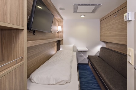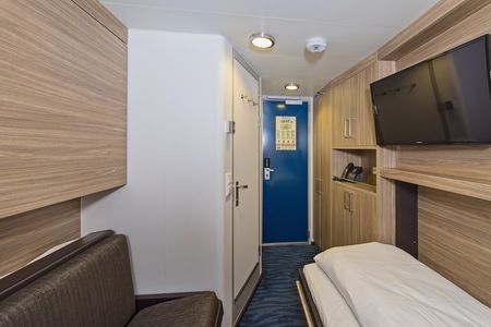 These comfortable, standard inside cabins for up to two people∘ on the lower deck have separate single beds, one of which converts into a sofa, plus one chair and desk.