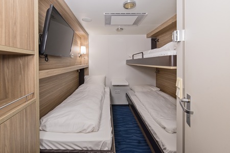 These comfortable, refurbished standard inside cabins for three people on the upper deck have separate single beds, one of which converts into a sofa, bunk beds, and a TV.