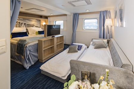 These comfortable, refurbished outside cabins for up to three people on the upper decks have separate beds, one of which converts into a sofa, bunk beds and a TV. The cabins have limited or no view.