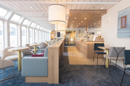 What really makes the Explorer Bar stand out is the atmosphere of the surrounding lounge and the panoramic views of the fjords through the floor-to-ceiling windows. Order from a range of hot and cold beverages, relax in a comfortable armchair, chat with a drink in hand, and watch the world go by.