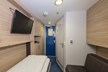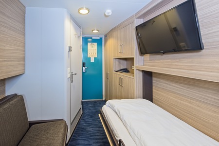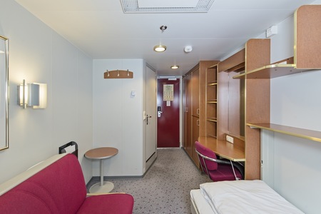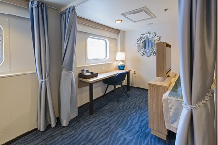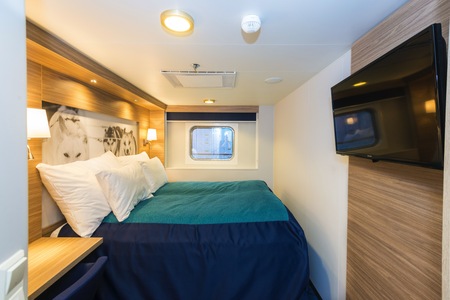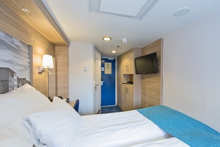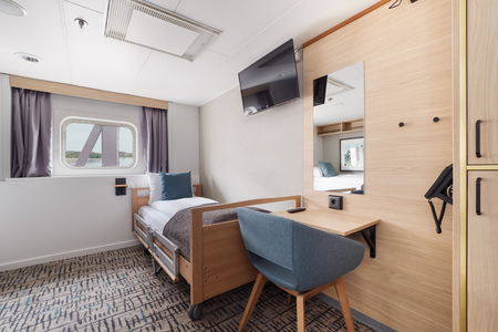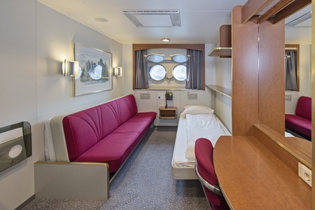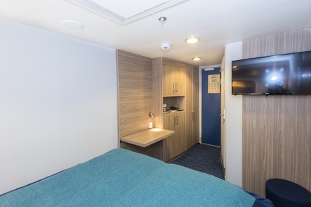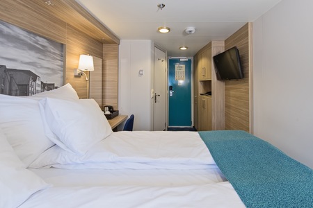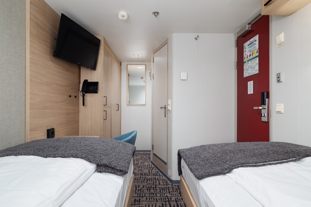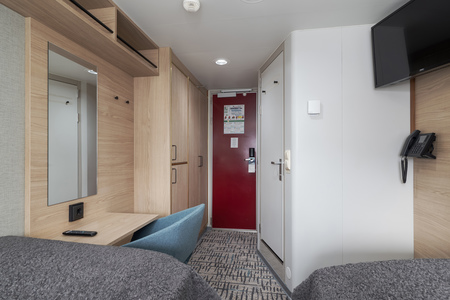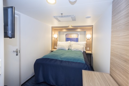 These comfortable outside cabins for up to 2 people have twin beds, a chair, TV, and a hairdryer. Most cabins have a porthole for natural light, but cabins 343 and 356 have a window.