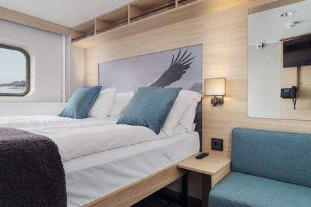 Arctic Superior cabins offer a step up in comfort. Located on a prime location on the ship, these outside-facing cabins come with a double bed and window with full view as standard. You’ll also find added comforts like a kettle with tea and coffee – small details that help you feel more at home. A calm, well-equipped space to unwind.