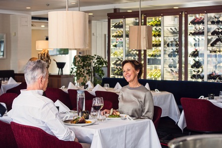 To accompany your meal, choose a wine from the expert selection on our wine list or opt for a wine package in which our best wine tasters have paired wine with the food. If you choose to upgrade to our Platinum package, you can dine here every day as part of your voyage.