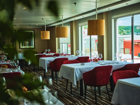 On sailings on the Original Coastal Express, your voyage is full board, with breakfast, lunch and dinner served in our main restaurant, Torget. Beverages are limited to tap water, coffee and tea at mealtimes; other drinks can be purchased separately.