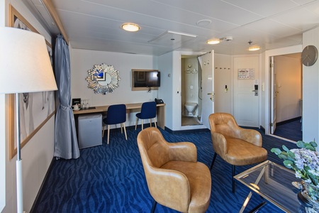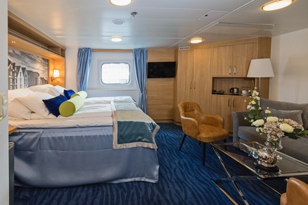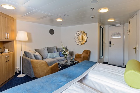These elegant suites on the upper deck for up to four people have a separate bedroom, a seating area with sofabed and two chairs, TV, minibar, hair dryer, coffee and tea facilities, and Wi-Fi.