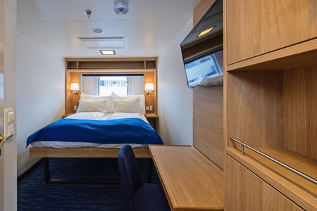 These comfortable, refurbished outside cabins for up to three people have separate beds or bunk beds, a chair, TV, and hair dryer. Please note that cabins 358 and 360 may experience noise.