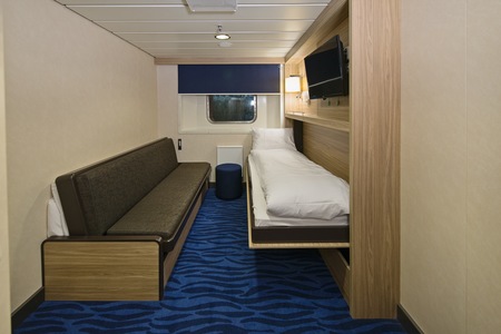 These standard inside cabins for up to two people on the upper and lower decks have separate beds, one of which doubles as a sofa, and a TV. None of the cabins have windows.