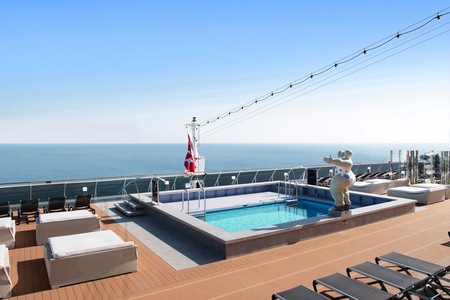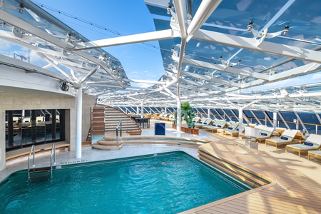 The MSC Yacht Club Sundeck & Pool is an exclusive luxurious outdoor area with captivating swimming pool, spacious sundeck, and relaxing large hot tubs for an remarkable luxury cruise experience.