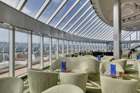 Extending over four decks, the multi-level glass-walled atrium represents an innovative and atmospheric entertainment venue for live music and other events. The two glass-floored catwalks beyond its glass walls offer guests spectacular ocean views.