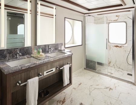 Up to three guests can enjoy the fabulous views from the aft-facing balcony of these Penthouses that include a queen-size bed plus a single sofa bed, luxurious bath with shower, a sitting area, and some even have a living and dining area. Includes butler and concierge service in select cabins.