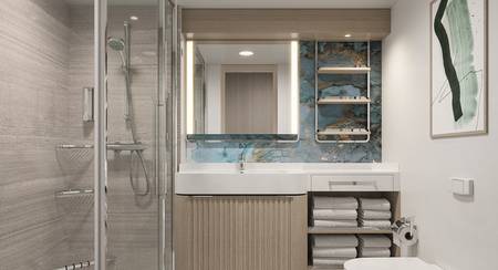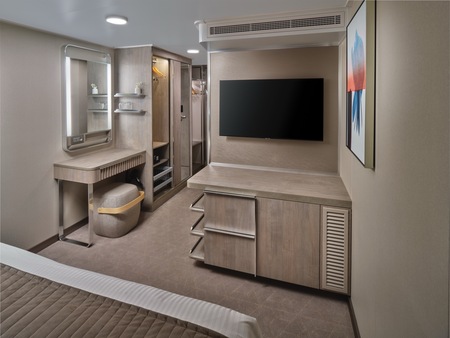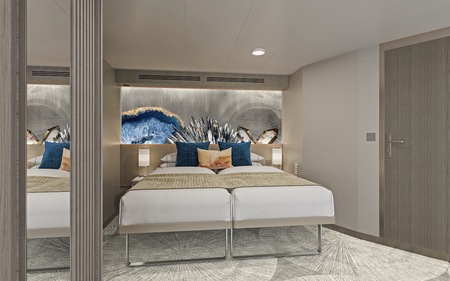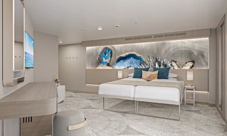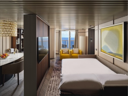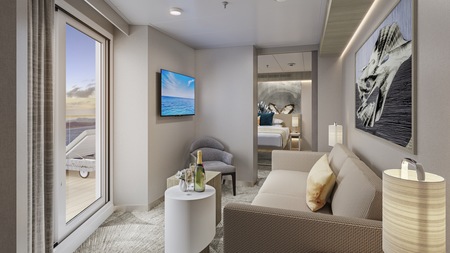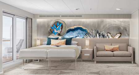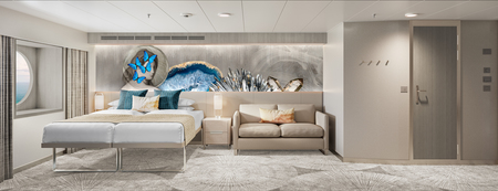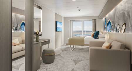 Marvel at the unparalleled views from the large, aft-facing balcony of these spacious, stylish Suites featuring two lower beds that convert to a queen and a double sofa bed. They also include butler and concierge service. Perfect for up to four guests to indulge in a picture-perfect holiday.