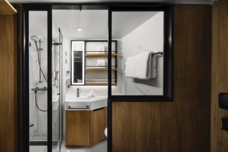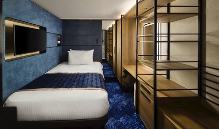 Private keycard access complex comprised of staterooms specifically designed and priced for the solo traveller. Featuring a full-size bed and separate area for your bathroom in almost 95 square feet of living space. Includes access to the private Studio Lounge. No single supplement required.