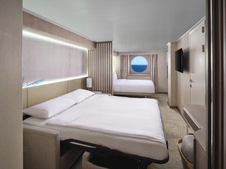 Perfect for families, these staterooms include two lower beds that convert to a queen, a double sofa bed to accommodate two more and a window offering beautiful views. Some also can connect to other staterooms for even more options.