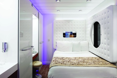 These staterooms feature a large round window and a queen-size bed. Staterooms are priced exclusively for solo travellers.