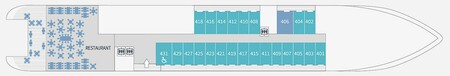 Towards the rear of deck 4 you'll find a panoramic restaurant large enough to accommodate all our passengers at one sitting. Offering a different concept than on our other ships, this space is open to the exterior and serves buffets of salads, desserts and cheeses. Our discreet and attentive staff provide a table service for hot meals