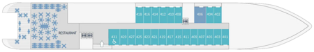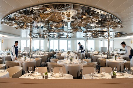 Towards the rear of deck 4 you'll find a panoramic restaurant large enough to accommodate all our passengers at one sitting. Offering a different concept than on our other ships, this space is open to the exterior and serves buffets of salads, desserts and cheeses. Our discreet and attentive staff provide a table service for hot meals.