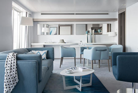 For the interior decoration, we took inspiration from the tones and colours of our destinations and used a palette made up of blues, from the soft, luminous grey-like tones of the polar ice to the vivid notes and turquoises of Mediterranean inlets and coves.