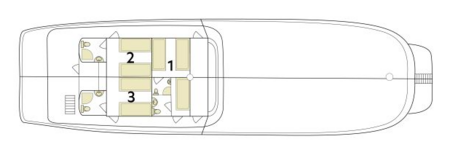 Cabins 1 - 3: These cabins measure approximately 11 square metres (118 square feet) and are located on the upper deck with fixed twin beds and one opening window plus one porthole window in the bathroom.