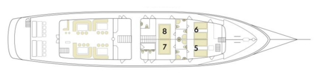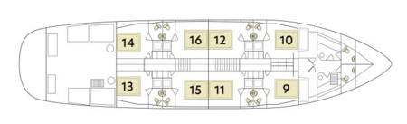 Cabins 9, 10, 13 and 14: These cabins measure approximately 13.5 square metres (145 square feet) and are located on the lower deck with fixed double bed and two porthole fixed windows.