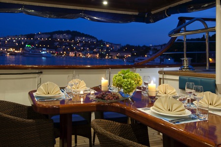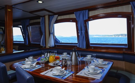 Dine in the air-conditioned restaurant where the attentive crew serves daily breakfast with hot and cold options and either lunch or dinner featuring local dishes, from salads to hot Mediterranean specialities, meats and fish. At the ‘Captain’s Dinner’ celebrate food from throughout the Adriatic. Moored in delightful ports overnight, on the remainder of the evenings you are free to dine where you wish.
