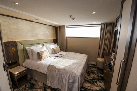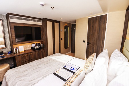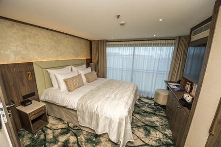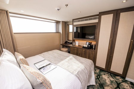The cabins are 16 square metres, featuring a fixed window overlooking the river. It also includes air conditioning, hairdryer, safe, TV, telephone, desk and tea/coffee-making facilities. The hotel-style beds can be configured as a double or twin, and the modern ensuite bathroom features a relaxing rain shower.