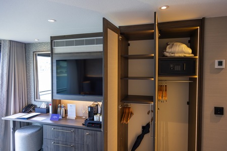 The cabin includes air conditioning, hairdryer, safe, TV, telephone, a desk, double wardrobe, a lounge chair and small table and tea/coffee-making facilities are available in every room. The hotel-style beds can be configured as a double or twin, and the room features an ensuite bathroom with a rain shower.