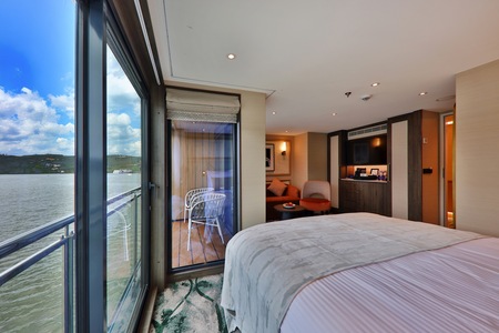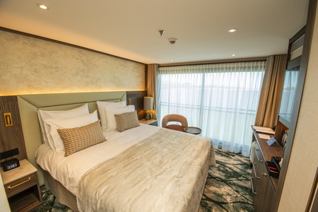 Enjoy your cabin, your way. Marvel at the views from your floor-to-ceiling glass doors or slide them away when the weather is warm to enjoy the views beyond your French balcony. The hotel-style bed can also be configured as a double or twin.
