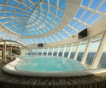 This stateroom offers a floor-to-ceiling, wrap-around panoramic window.