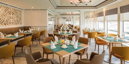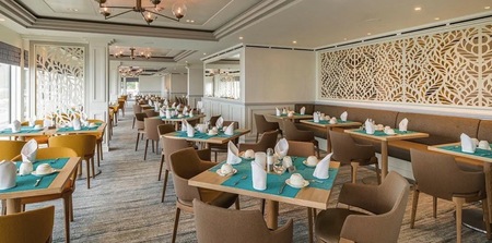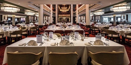 The main dining venues are The Grand Dining Room and more informal Grill, open for breakfast, lunch and dinner. Here, open seating is the norm, so you can dine whenever you like within the opening hours.