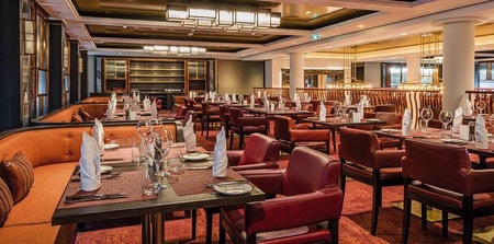 Recalling the famous music lounges of the 1950s, The Club combines sumptuous cocktails and dining with live music. The cuisine rivals the world’s best supper clubs, with classic starters such as Retro Tiger Prawn Cocktail and Baked Three Onion Soup. Among the sumptuous mains, you can experience signature dishes; New York Striploin Steak, Tomahawk Steak, Roast Rack of Lamb, Berkshire Porterhouse Pork Steak, Grilled Fish of the Day and Baked Aubergine with Bulgar Wheat and Grilled Halloumi. As with all the restaurants aboard Spirit of Discovery, dining in The Club is included in your fare.