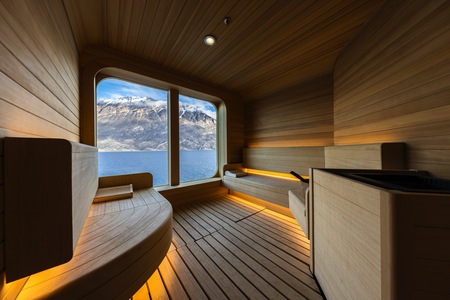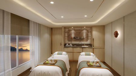 Expansive apartment-style suite stretching over two decks located midship. Entry opens to seamless double height views and generous lower level living area large enough for entertaining with a dining table for four, separate guest bath and pantry with wet bar stocked with a customised selection of spirits. Sculptured staircase leading to upper level and the master bedroom with a queen-sized Duxiana Axion 15 adjustable high-performance sleep system facing expansive windows, a wall of closets along with advanced technology including a roll-up LG OLED TV. Separate walk-in closet adjacent to the five-piece bathroom complete with a whirlpool spa tub and separate shower. Wintergarden suite guests also enjoy wildlife and vista spotting using a Swarovski ATX Interior spotting scope. The tripod-mounted scope, with its 25-60x85 lens capability, is for use in-suite while onboard. Entertainment experience features a high-end Bang & Olufsen Beolab 5 speaker system and Bang & Olufsen H4 Bluetooth headphones for guest use onboard.
