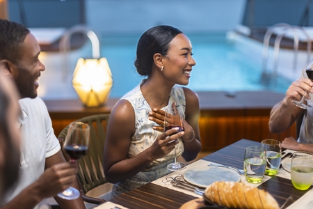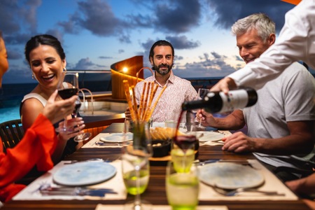 Each evening, our skilled Earth & Ocean chefs create an imaginative array of fresh, inventive dishes—a sophisticated menu celebrating eclectic traditional flavors from around the world, served in a relaxed setting under the stars for a distinctive dining experience unlike any other on board.