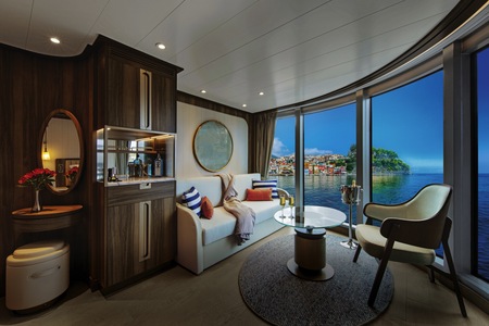 All Panorama Veranda Suites onboard Seabourn Venture feature a comfortable living area; private veranda; queen-size bed or two twin beds; walk-in closet; personal safe; interactive TV with music and movies; fully stocked bar and refrigerator; writing desk with personalised stationery; makeup vanity; spacious bathroom, separate tub and shower, plush robes, slippers, luxury health and beauty products, hairdryer and 110/220V AC outlets.